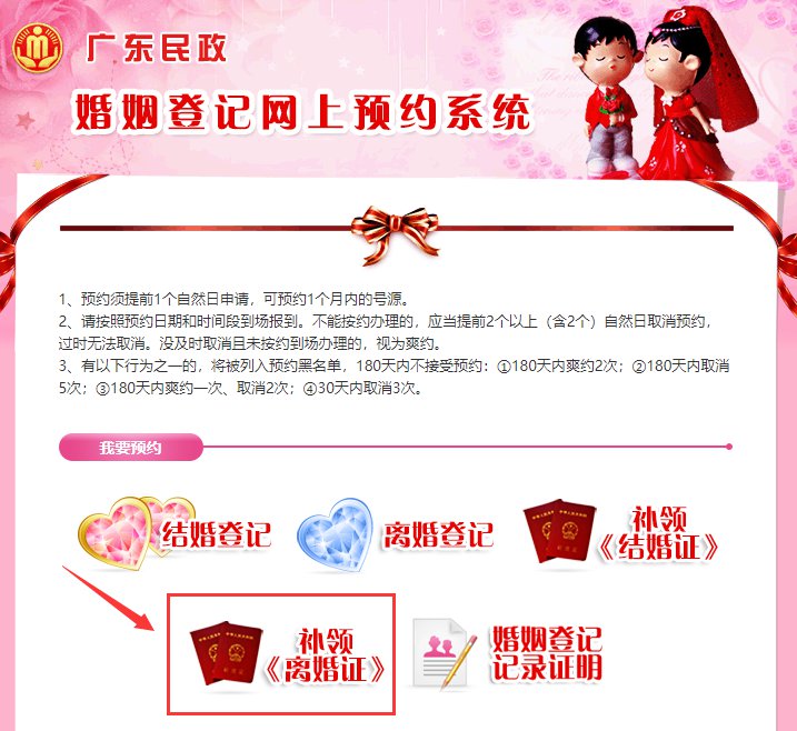 (一)申请补领婚姻登记证的当事人商量好办证时间,登录广东省婚姻登记预约系统,提前预约补领时间和补领机关。