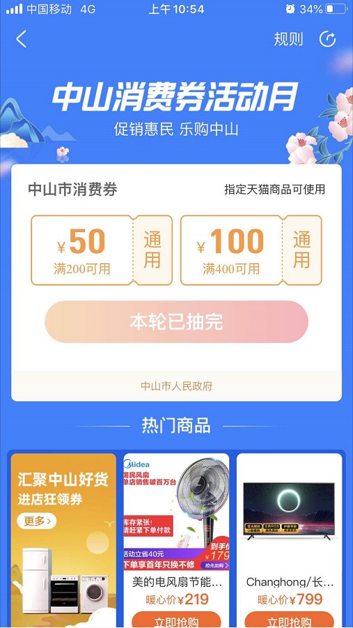 消费券领取后3天有效,仅限本次活动指定的工商注册地在中山的天猫商户(天猫国际除外)可用。