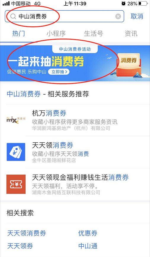 在支付宝首页搜索“中山消费券”,会弹出蓝色的广告栏,点击即可进入领取。
