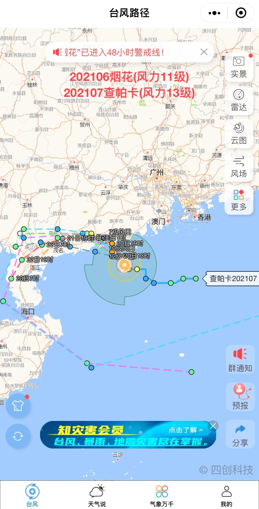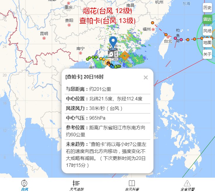 预计20日南海北部海域、广东中西部沿海、海南岛东部和南部沿海将有6-7级大风,其中广东江门和阳江沿海风力8-10级,“查帕卡”中心经过的附近海域或地区风力有11-13级,阵风可达14-15级。受台风“查帕卡”影响,未来我市风雨增强。