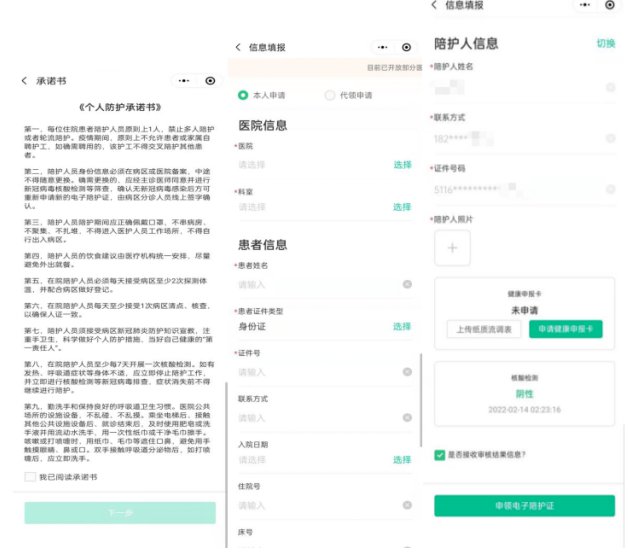 备注:选择医院和科室,填写患者信息和陪护人信息后,系统会自动获取陪护人在该医院当天的健康申报卡信息和7天内核酸检测记录,如无法自动获取信息,则需要申请健康申报卡或上传纸质流调表和手动上传7天内核酸检测纸质报告。