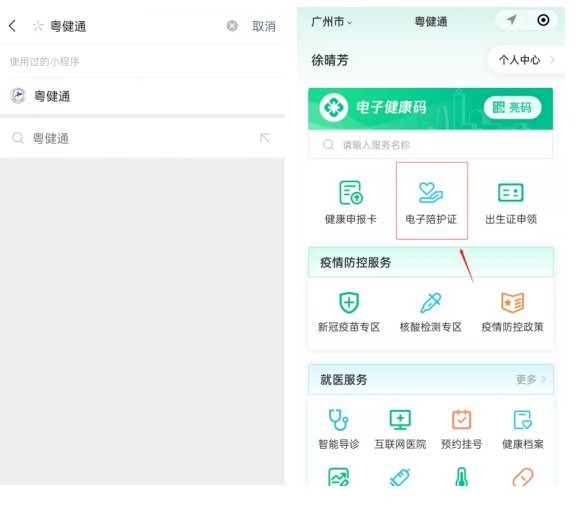提交完成,医院审核通过后,可在粤健通微信小程序点击“电子陪护证”查看电子陪护证(有效期7天)。