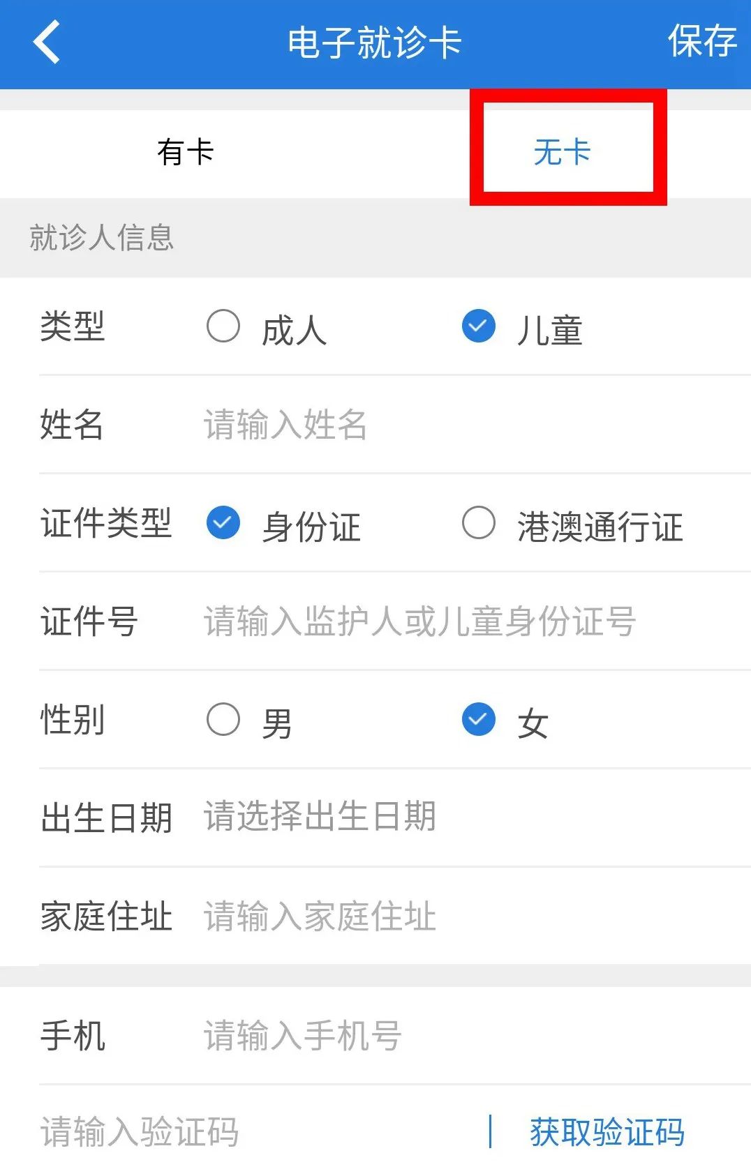 3、无就诊卡的首诊患儿,点击“无卡”,填写相关信息申请电子就诊卡。