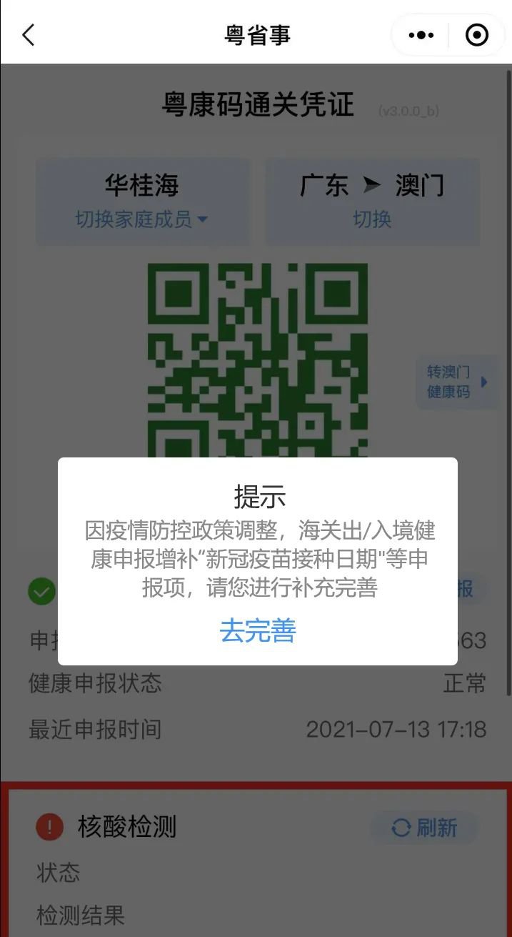 第一步,使用微信扫描“粤康码”小程序码,或在微信搜索“粤省事”小程序,点击“通关凭证”进入,选择广东→澳门或澳门→广东填报健康申报信息。