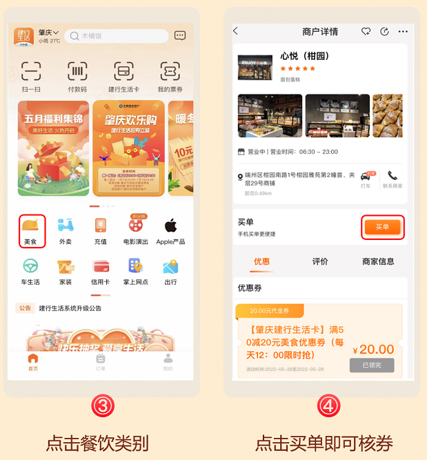 市民通过打开建行生活APP点击所领的优惠券,到店消费,在结账时核销即可。