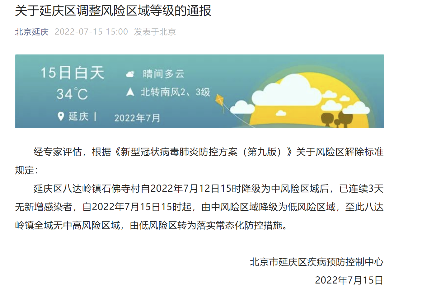 据北京延庆官微消息,经专家评估,根据《新型冠状病毒肺炎防控方案(第九版)》关于风险区解除标准规定: