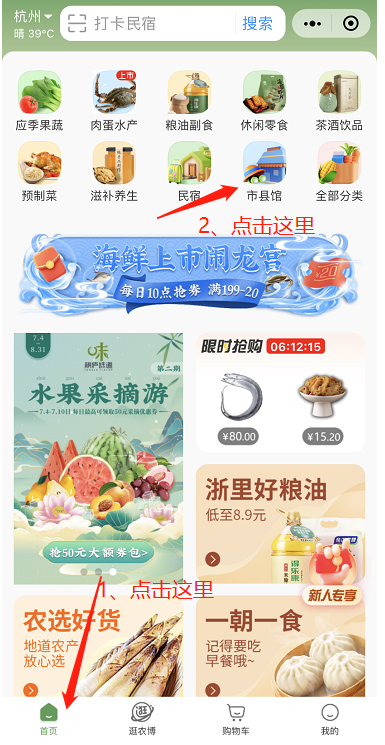 1、直接在微信端搜索“网上农博小程序”即可,初次进入可以先登录。进入到“网上农博”首页,在首页点击“市县馆”,进入下一页面,选择“余杭区”。