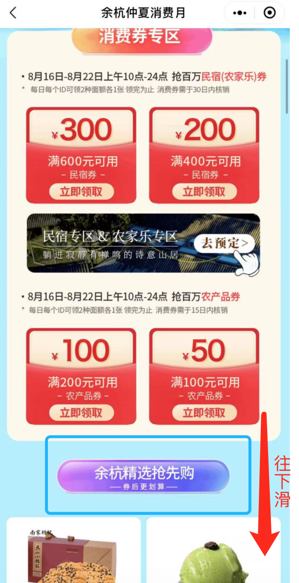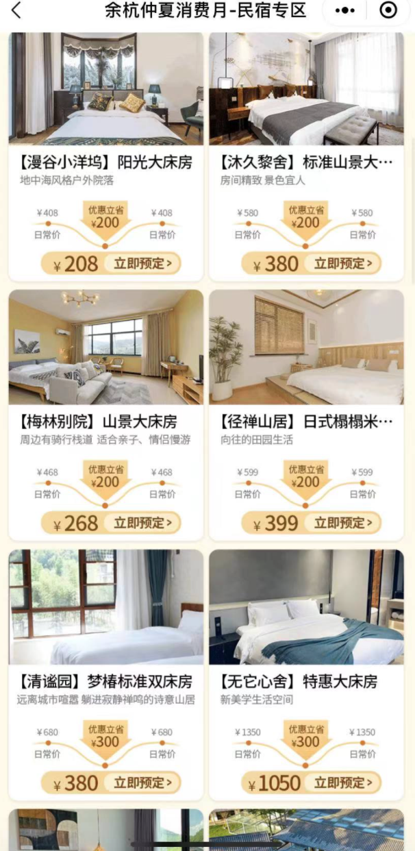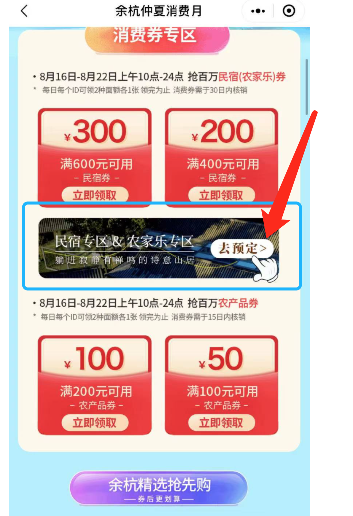 2、然后就可以看到此次活动的页面,看到民宿(农家乐)的消费券专区,点击“去预定”