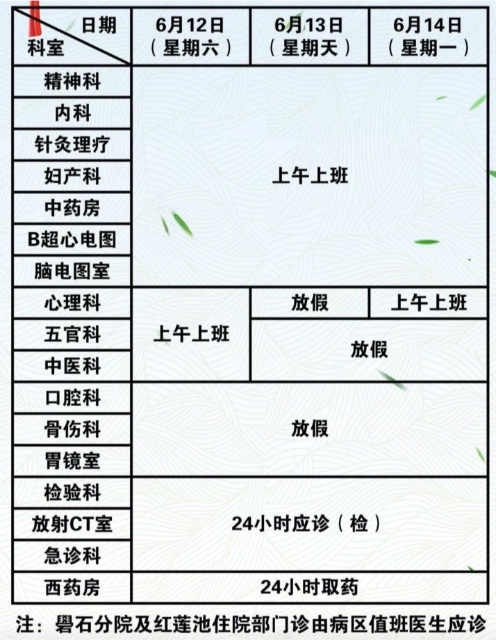 | 6月12日(星期六) | 上午开诊、下午休息 |