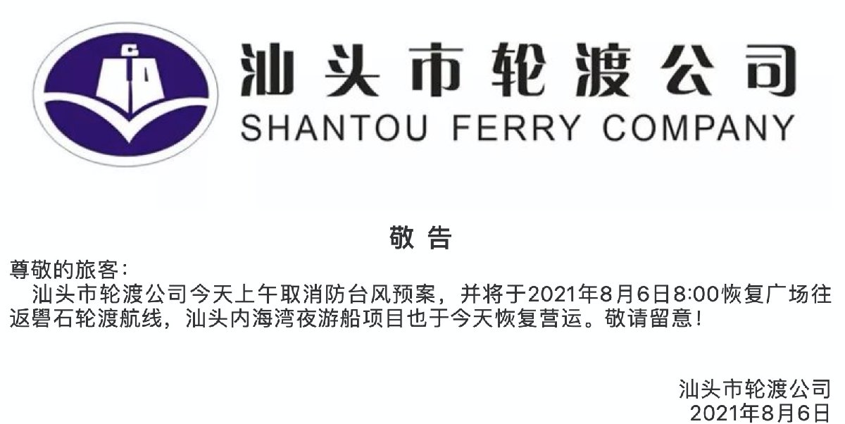 汕头市轮渡公司今天上午取消防台风预案,并将于2021年8月6日8:00恢复广场往返礐石轮渡航线,汕头内海湾夜游船项目也于今天恢复营运。敬请留意!