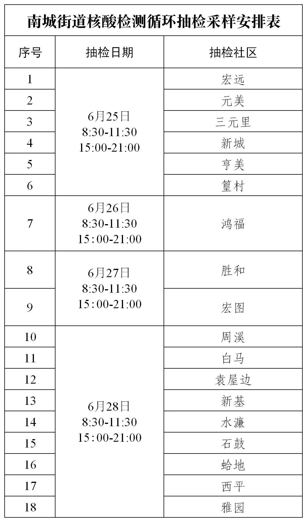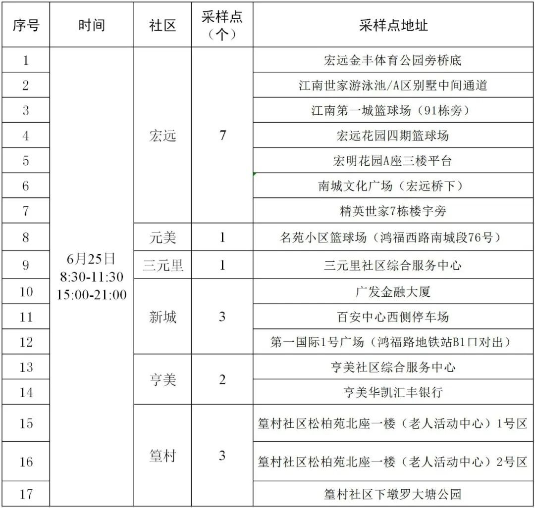 4、循环核酸抽检期间,南城文化广场便民采样点(6月26日-28日)暂停服务。其余便民采样点在该区域未进行循环抽检时继续启用,费用免费。