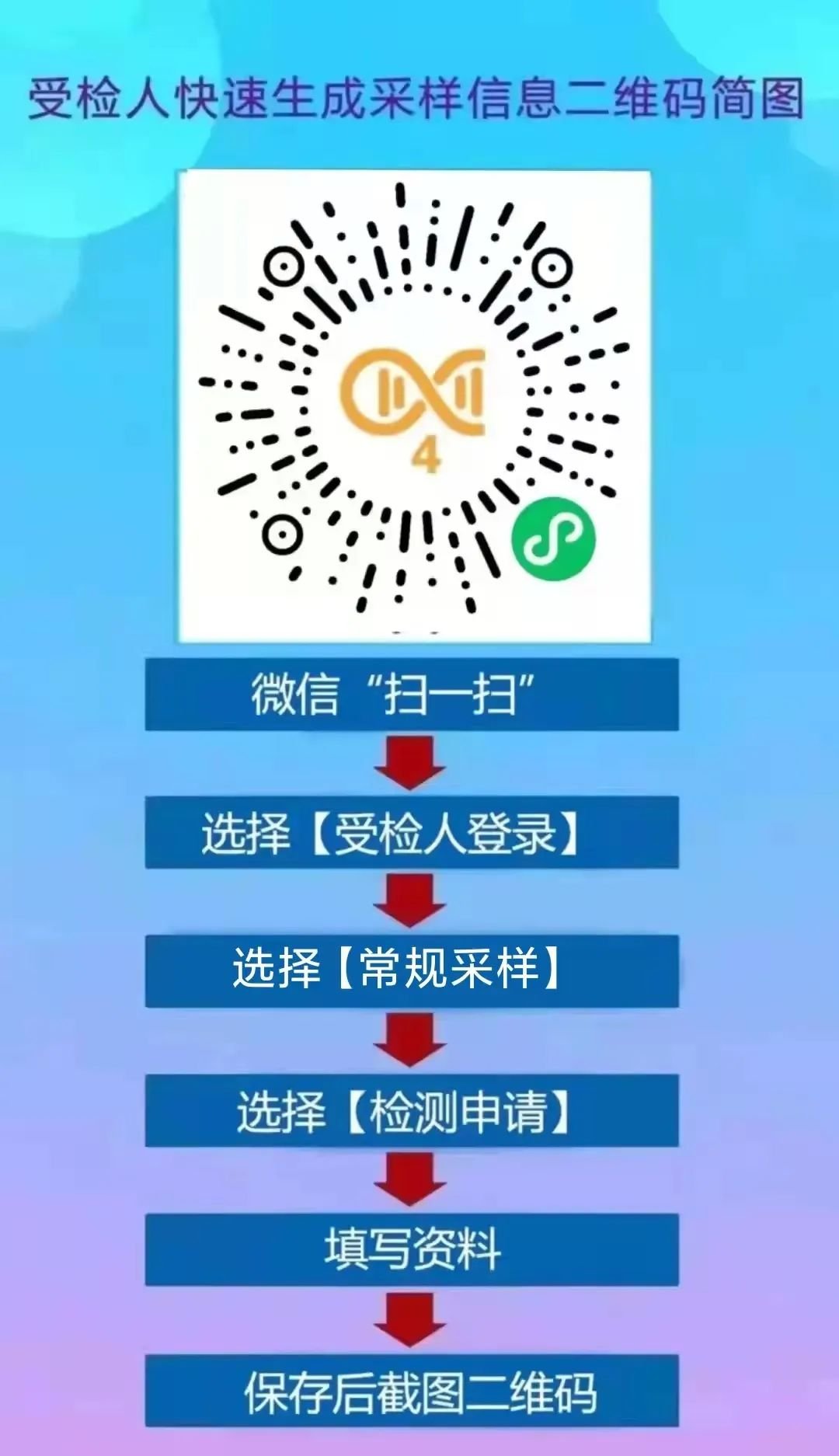 为提高检测效率,请提前在家录入信息,并截图保存二维码(之前已申请的依然有效),到采样点后直接向工作人员展示二维码截图,减少等候。现场检测带上有效身份证件供核验。