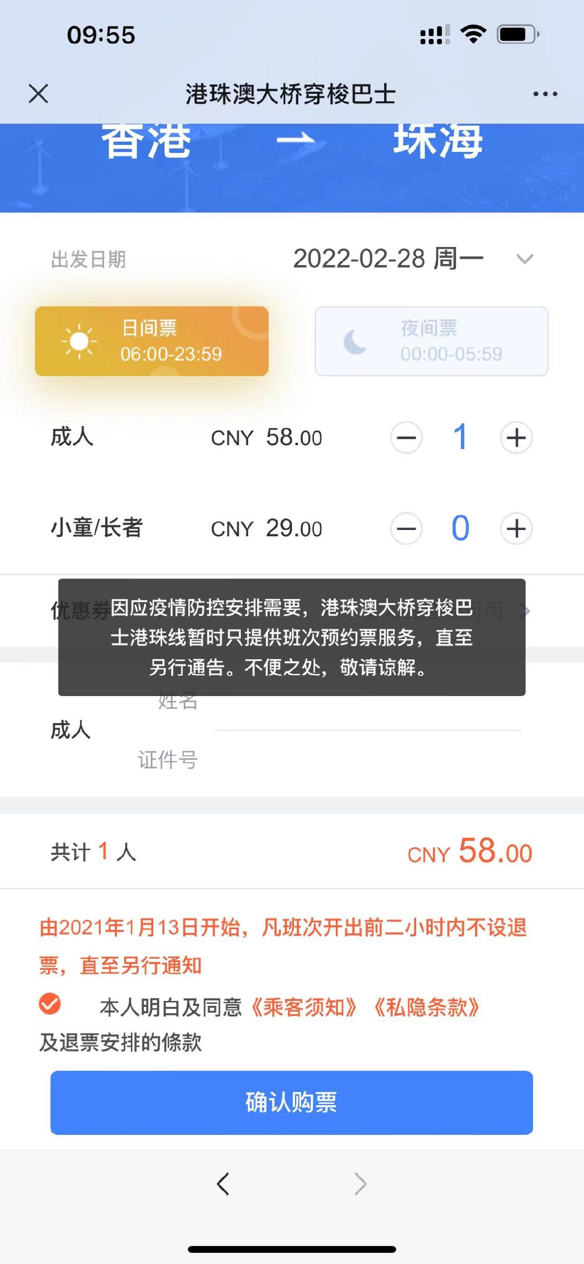 因应疫情防控安排需要,港珠澳大桥穿梭巴士港珠线暂时只提供班次预约票服务,直至另行通告。不便之处,敬请谅解。
