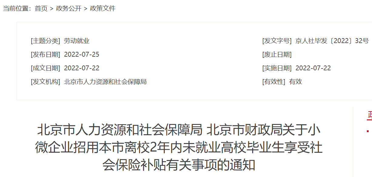 为进一步促进高校毕业生就业,对小微企业招用本市离校2年内未就业高校毕业生,符合条件的给予社会保险补贴。现就有关问题通知如下: