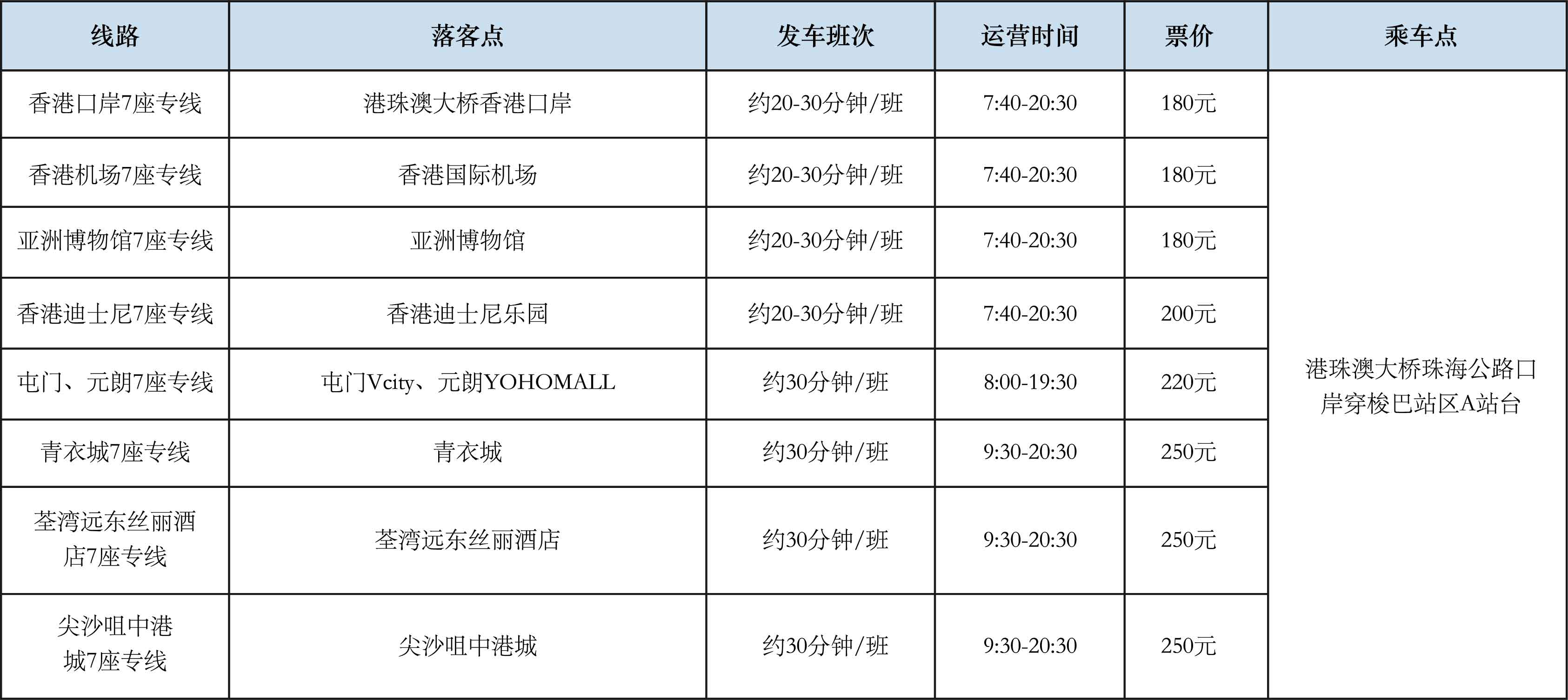 1、从珠海公路口岸到香港:设有七座商务车,可直达香港国际机场、香港迪士尼乐园、港珠澳大桥香港口岸、亚洲博物馆、屯门元朗、青衣城、荃湾远东丝丽酒店、尖沙咀中港城等地。