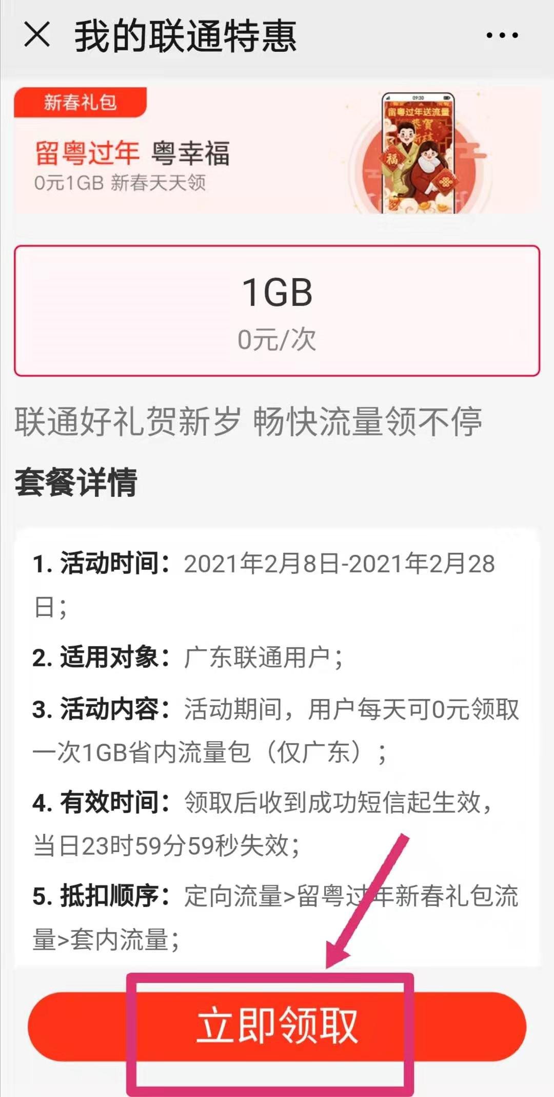 领取次数:活动期间,用户每天可0元领取一次1GB省内流量包(仅广东)