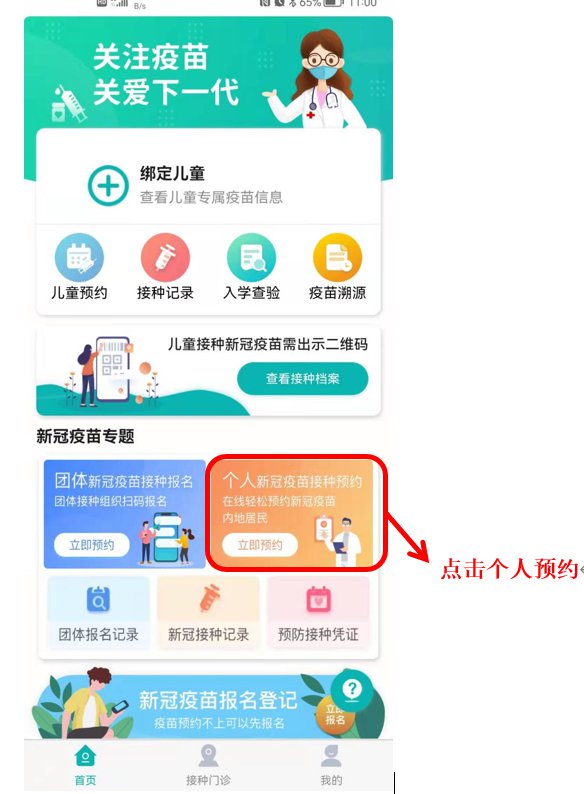 第一步:进入粤苗APP,点击首页的【个人新冠疫苗接种预约】;