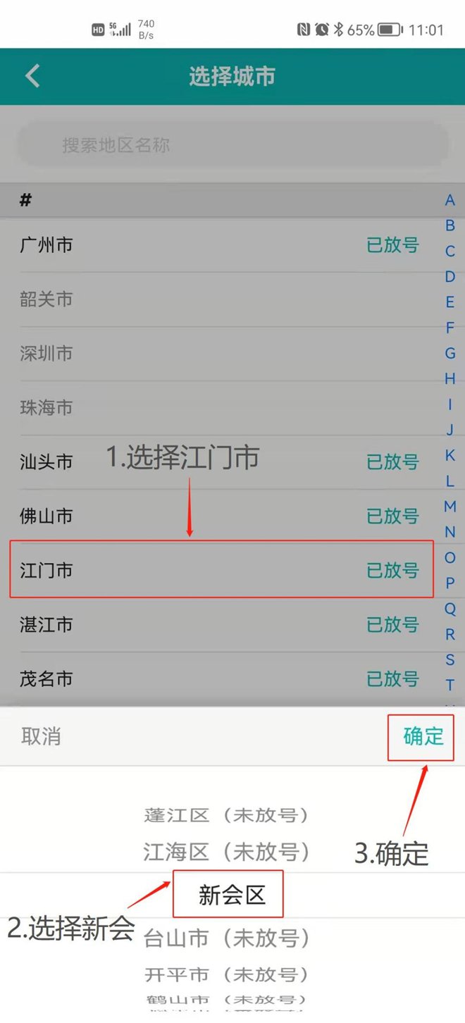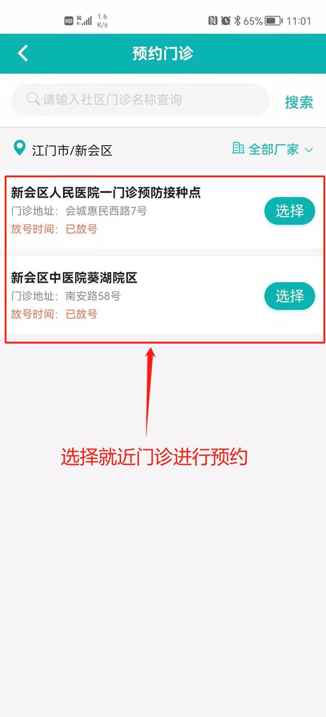 第四步:选择江门市及新会区,在选择开放预约的门诊即可完成。