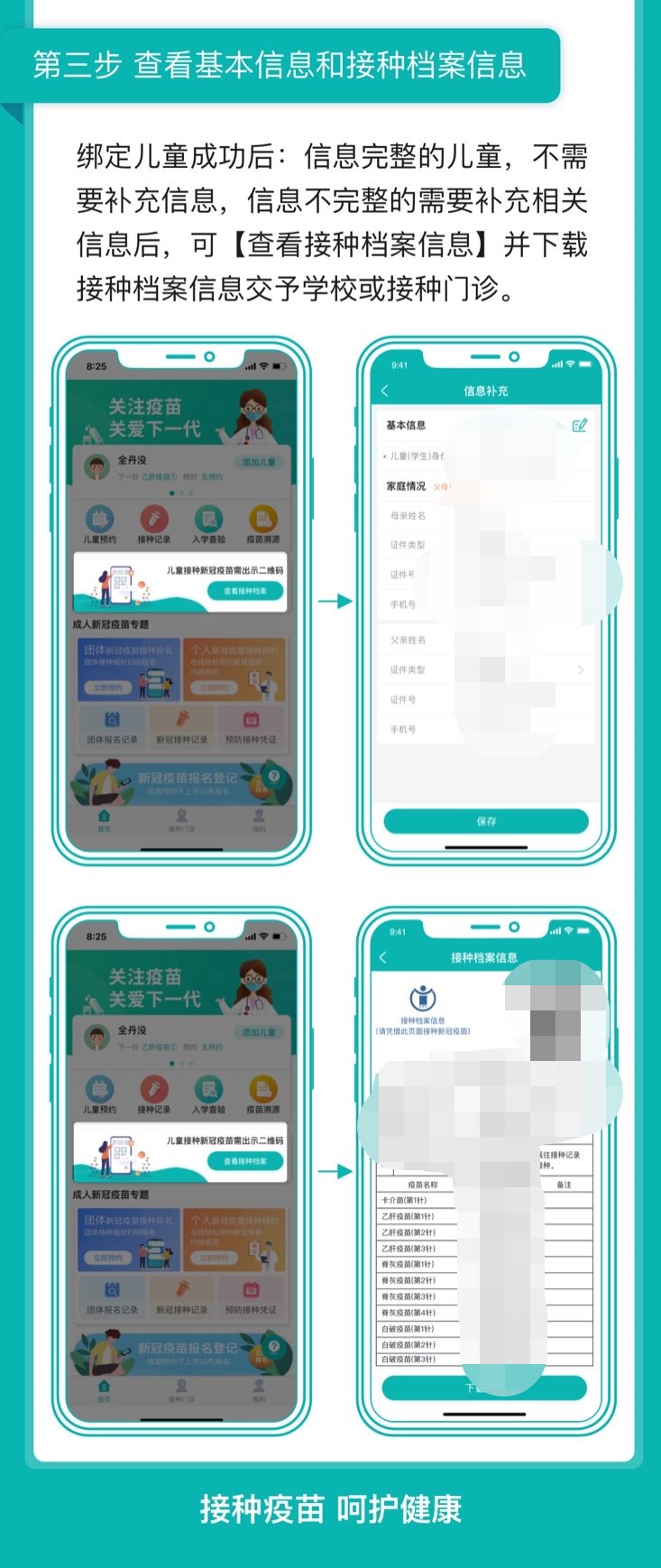 监护人通过粤苗APP或粤健通微信小程序预先登记孩子和家长的信息,绑定孩子在省疫苗系统中已有的档案,并自助完善档案中孩子身份证号码、父母姓名和身份证号码等必需信息,生成接种档案信息二维码。