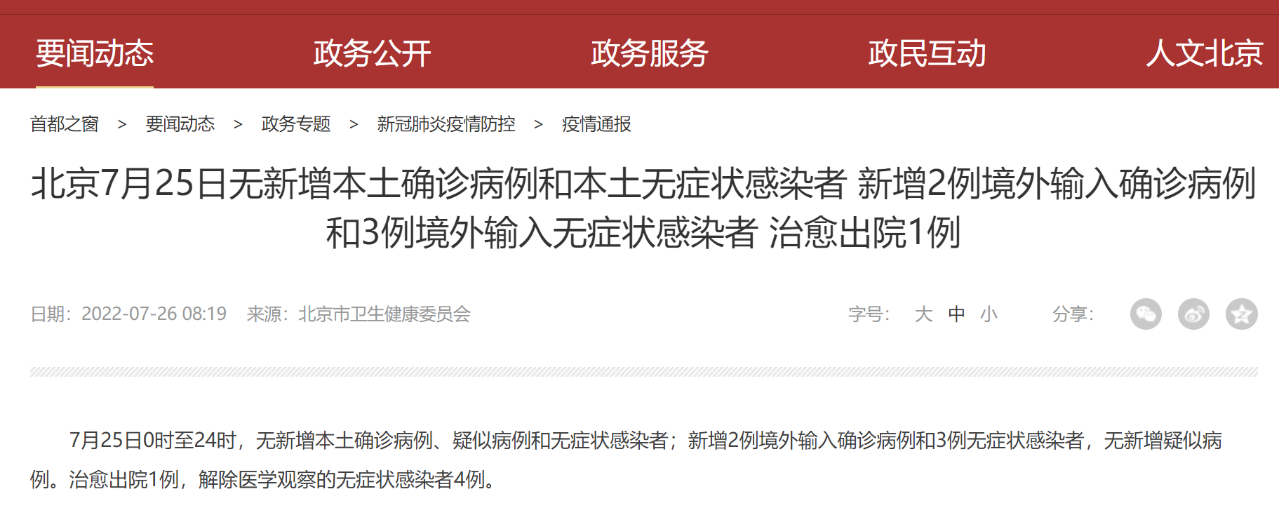 北京7月25日无新增本土确诊病例和本土无症状感染者