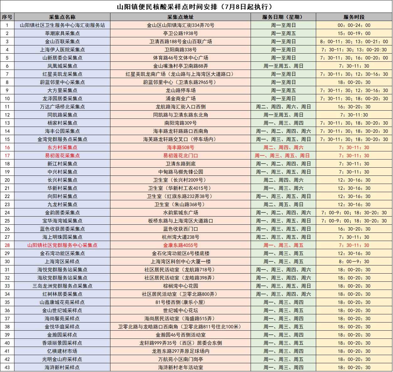 根据疫情防控总体形势和工作要求,7月8日起,常态化核算采样点开放时间按下表执行(其中东方村、易初莲花、山阳镇社区党群服务中心点位采样时间有调整)。