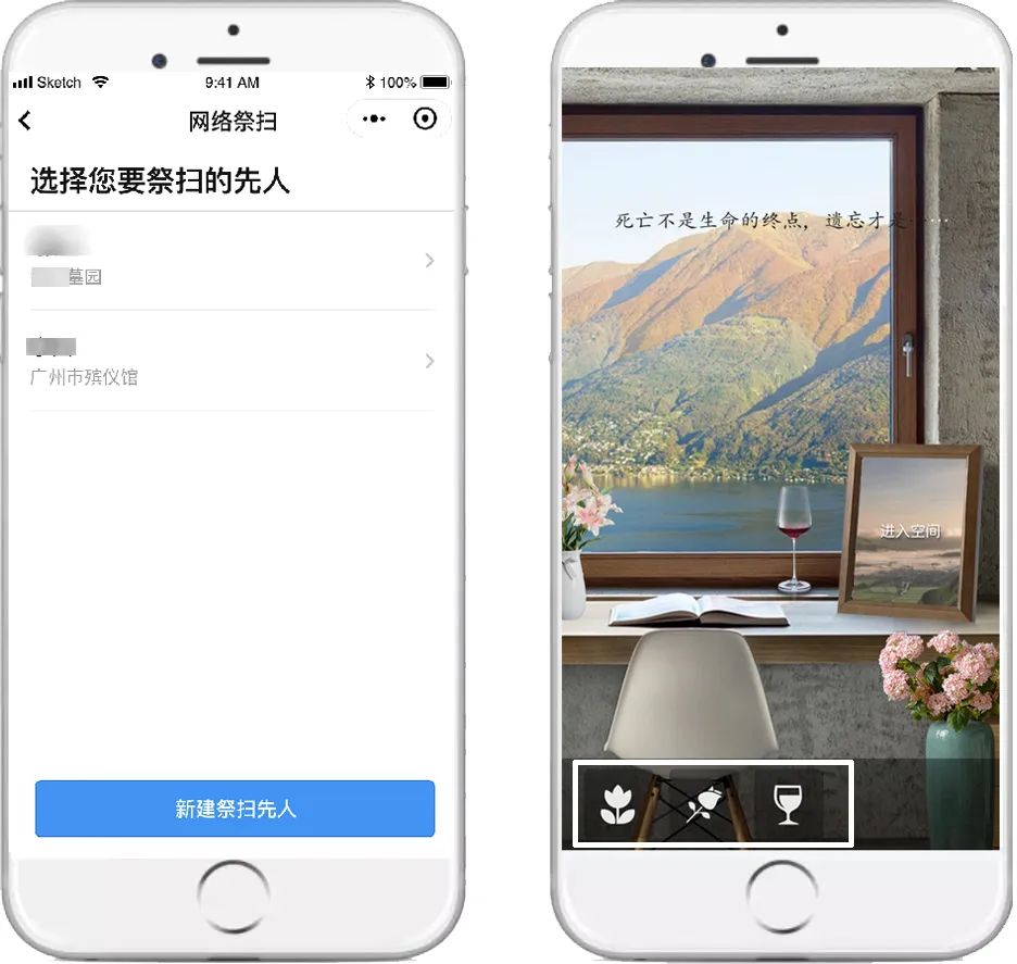 在祭扫服务首页点击“网络祭扫”,选择需要祭扫的先人,进入祭扫页面。