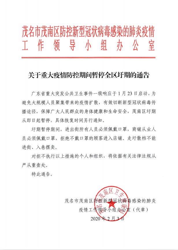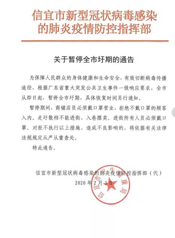 为保障人民群众的身体健康和生命安全,有效切断病毒传播途径,根据广东省重大突发公共卫生事件一级响应要求,全市从即日起,暂停全市圩期,具体恢复时间另行通知。
