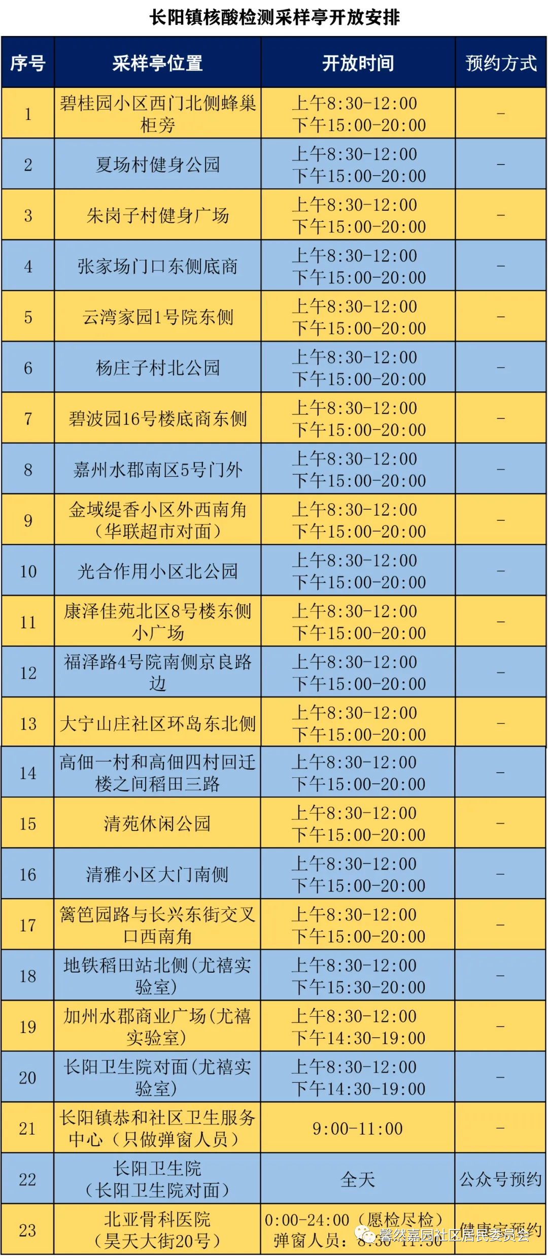 按照长阳镇统一安排,馨然嘉园社区2022年7月8日进行常态化核酸检测,院外核酸采样亭同时开放。请社区居民携带本人身份证原件(儿童带社保卡等)在规定时间段内,分别到一、二区核酸采样点或院外核酸采样亭进行检测。