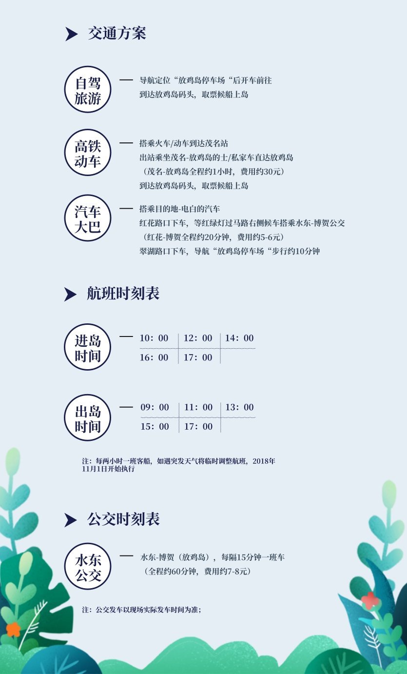 上岛时间:9:00、10:00、12:00、14:00、16:00、17:00(最后一班只为住岛10人以上开)。