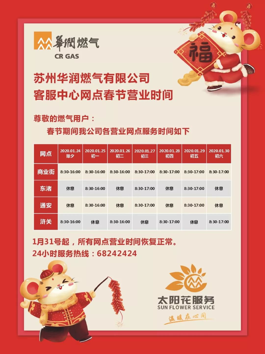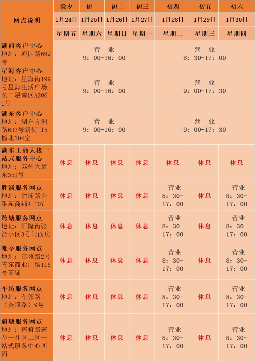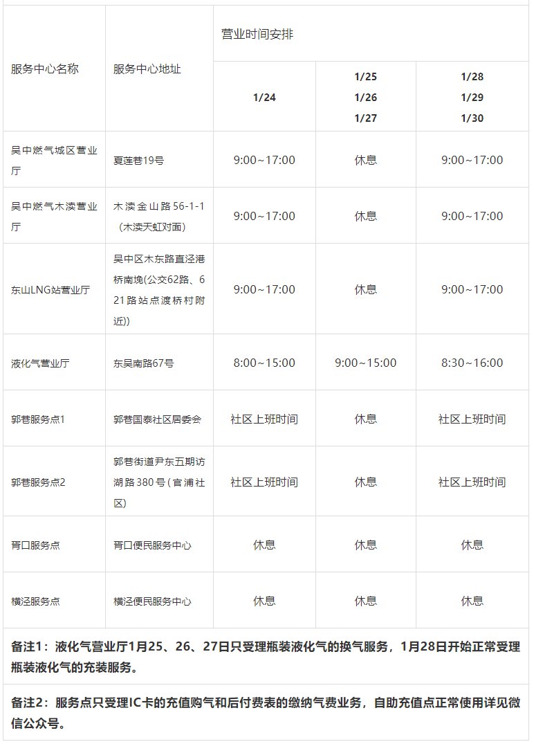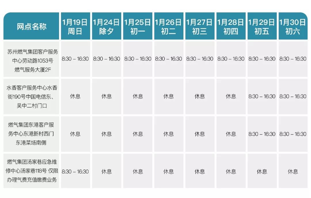 2020春节苏州燃气服务网点营业时间: