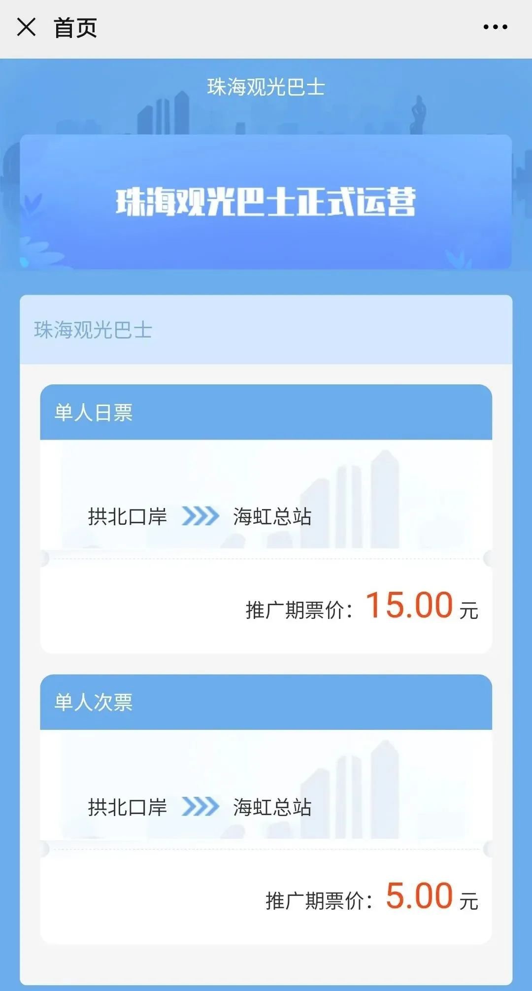 24小时内有效(以第一次刷码或卡时间起计算),现推广优惠价15元/人;乘客可通过“珠海观光巴士”微信公众号菜单购票,凭日票二维码或持观光巴士卡乘坐。
