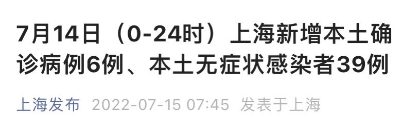上海市卫健委7月15日通报:2022年7月14日0—24时,新增本土新冠肺炎确诊病例6例和无症状感染者39例,均在隔离管控中发现。