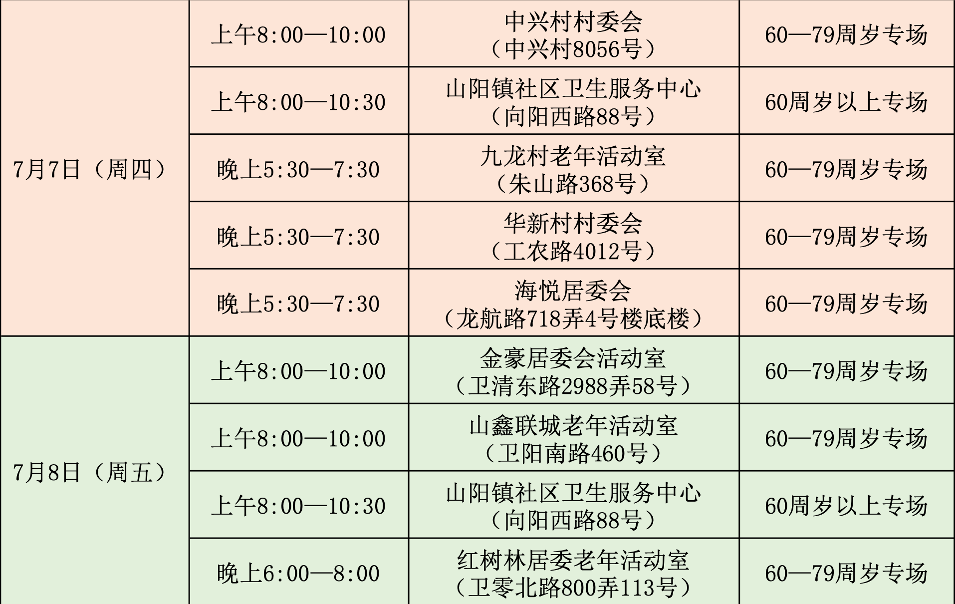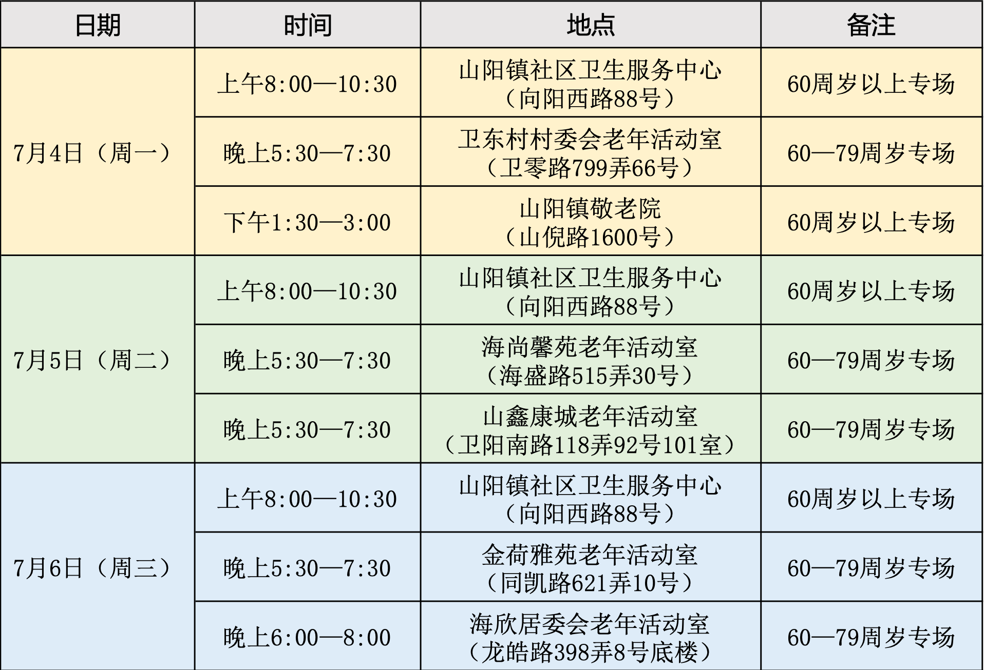 7月4日至7月10日,山阳镇新冠疫苗接种安排发布,请还没接种新冠疫苗的老年朋友们按照下表时间,有序前往指定点位接种。