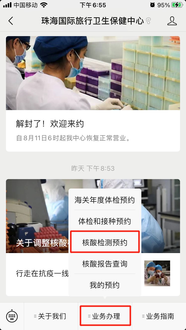 微信搜索并进入【珠海国际旅行卫生保健中心】公众号,点击菜单栏【业务办理】,选择【核酸检测预约】;