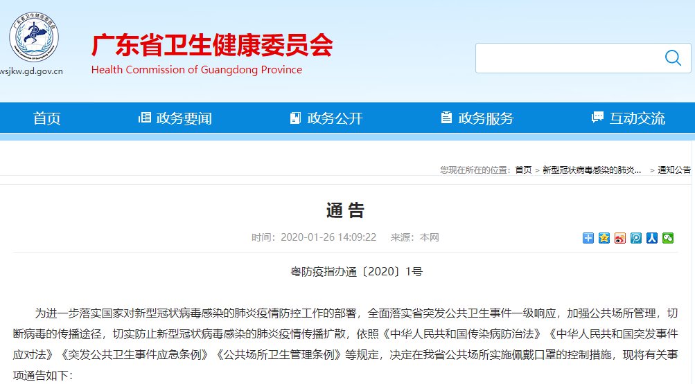 为进一步落实国家对新型冠状病毒感染的肺炎疫情防控工作的部署,全面落实省突发公共卫生事件一级响应,加强公共场所管理,切断病毒的传播途径,切实防止新型冠状病毒感染的肺炎疫情传播扩散,依照《中华人民共和国传染病防治法》《中华人民共和国突发事件应对法》《突发公共卫生事件应急条例》《公共场所卫生管理条例》等规定,决定在我省公共场所实施佩戴口罩的控制措施,现将有关事项通告如下: