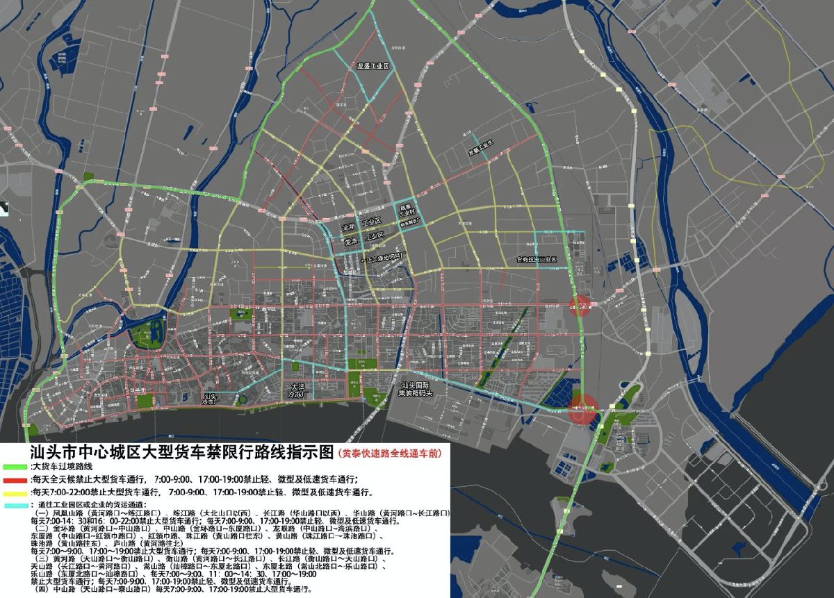 (一)金砂西路、杏花桥、杏花路、西堤路(海滨路口——永泰路口)、光华路、汕樟路(金凤路口——乐山路口,该路段在黄泰快速路全线通车后由过境路改为限行)、珠池路(天山路口——黄山路口)、榕江路、珠江路(衡山路口——黄山路口)、金湖路(护堤路口——金环路口)、练江路(大北山路以东)、长江路(天山路口——华山路口、衡山路以东)、兴业路、天山路(珠池路口——长江路口)、汕樟路(金砂路口——金凤路口)、潮汕路(杏花路口——大学路口)、衡山路(珠池路口——长江路口、黄河路以北)、嵩山路(珠池路口——东厦北路口)、黄山路(珠江路以北)、庐山路(珠池路口——黄河路口)、东厦路(中山路口——乐山路口、红领巾路口以南)、天山北路(东厦北路口——汕汾路口)、华山路(金砂路口——长江路口、黄河路口以北)、中山路(金环路口——天山路口)。