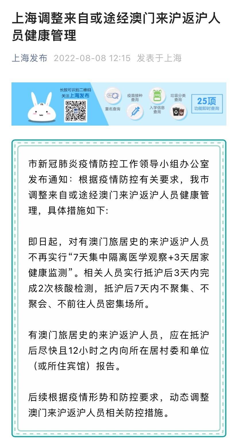 2022年8月8日,上海市新冠肺炎疫情防控工作领导小组办公室发布通知:根据疫情防控有关要求,我市调整来自或途经澳门来沪返沪人员健康管理,具体措施如下: