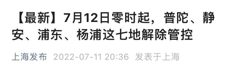 上海市新冠肺炎疫情防控工作领导小组办公室发布消息:根据国家第九版新冠肺炎疫情防控方案要求,经市新冠肺炎疫情防控工作领导小组办公室研究决定,自2022年7月12日零时起,将普陀区曹杨新村街道芙蓉园小区,普陀区石泉路街道石泉一村,静安区临汾路街道临汾路541号、551号、573号、583号,静安区彭浦镇永和二村,静安区曹家渡街道长宁路189号、177号,浦东新区金杨新村街道浦东大道2511弄19号城市e族公寓,杨浦区定海路街道隆昌路394号解除管控,上海市其他区域风险等级不变。