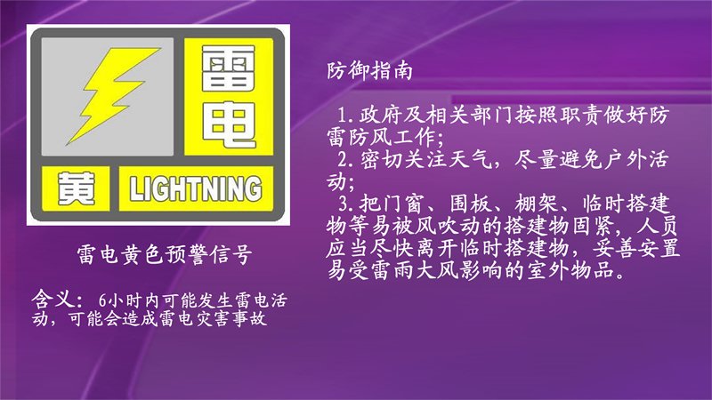 桂林市气象台12日4时12分继续发布雷电黄色预警信号:预计未来6小时内市区可能发生雷电大风天气,可能会造成雷电大风灾害,请做好防范。