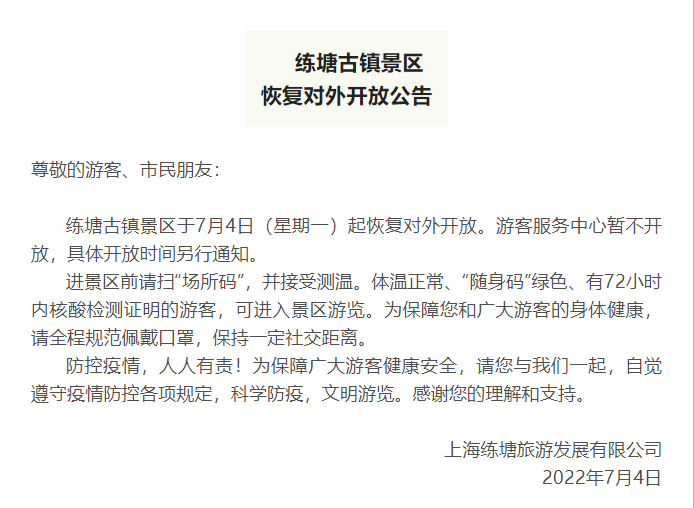 练塘古镇景区恢复对外开放公告