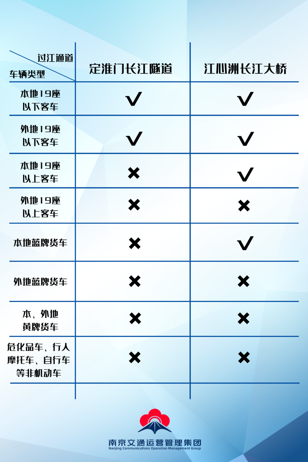 定淮门长江隧道:夜间采取单双日交替封闭、24小时可通行方式,以凌晨后的日期为准,单日定淮门线开通,双日扬子江线开通,夜间封闭维护时间为23点到6点。