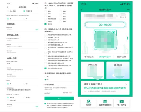 备注:选择医院和科室,填写患者信息和陪护人信息后,系统会自动获取陪护人在该医院当天的健康申报卡信息和7天内核酸检测记录,如无法自动获取信息,则需要申请健康申报卡或上传纸质流调表和手动上传7天内核酸检测纸质报告。
