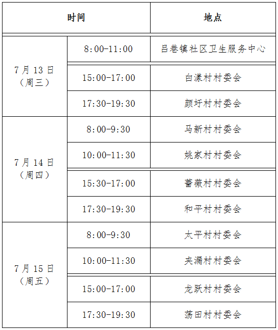 7月13日—15日吕巷镇疫苗接种安排
