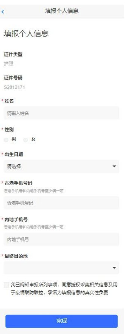 2. 填报项包含姓名、性别、出生日期、香港手机号码、内地手机号码、最终目的地、勾选“我已阅知申报所列事项,同意授权采集相关信息用于疫情联防联控,承诺为填报信息的真实性负责”条款。