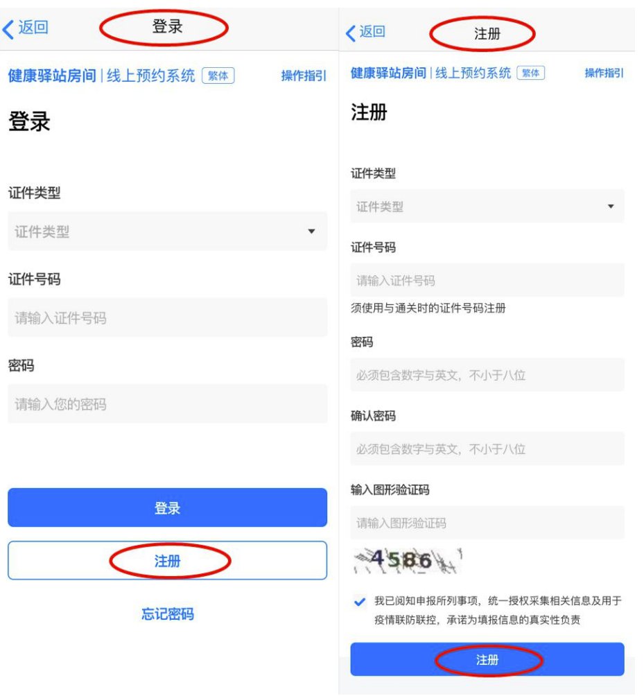 用户进入系统登录页,如已注册过账号,则通过证件类型、证件号码和密码进行登录;如首次使用该系统,在登录页面下方点击“注册”按钮,进入注册页面,通过填写如下数据项,进行注册。