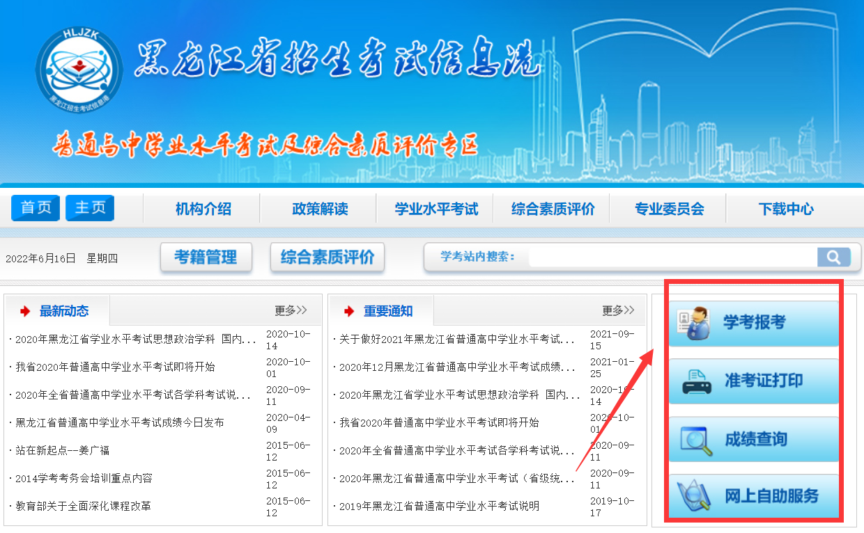 考生可登陆黑龙江招生考试信息港,进入后点击“高中学考”,点击右边的“学考报考”、"成绩查询" 等即可进入平台。