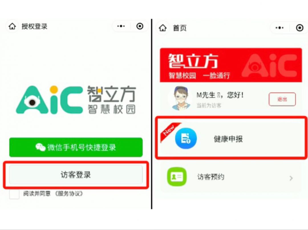 2)点击【访客登录】——进行【健康申报】——填写【学生资料完善】进行申报。