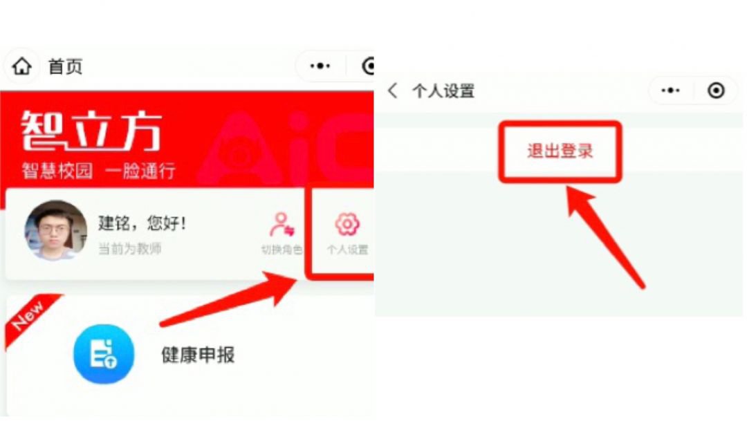 1)进入小程序,点击【个人设置】——点击【退出登录】,即可重新回到绑定界面;