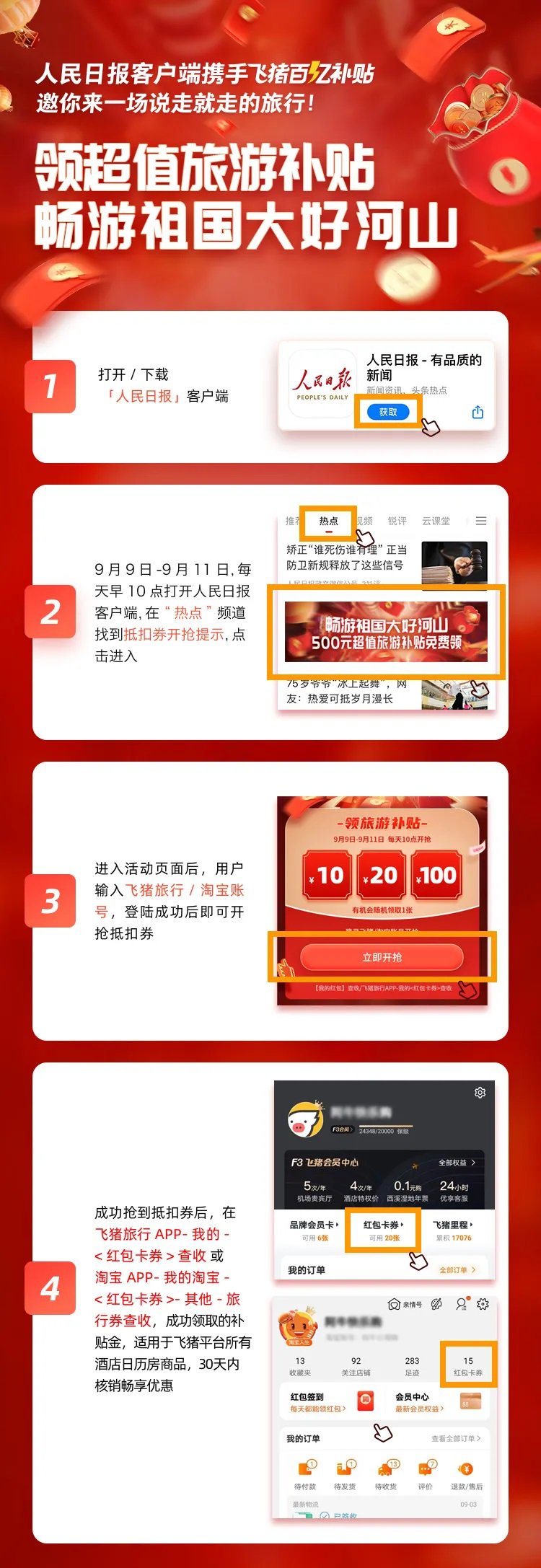 2、9月9日-9月11日每天早10点打开人民日报客户端,在“热点”频道找到抵扣券开抢提示,点击进入