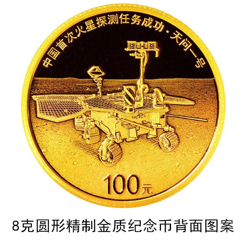 8克圆形金质纪念币背面图案为“祝融号”火星车,衬以火星表面环境组合设计,并刊“中国首次火星探测任务成功·天问一号”字样及面额。